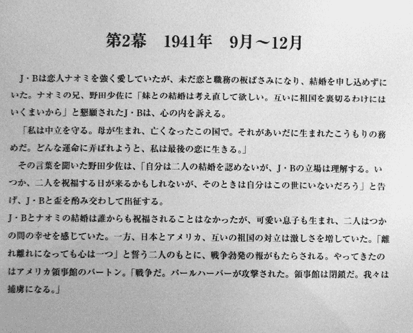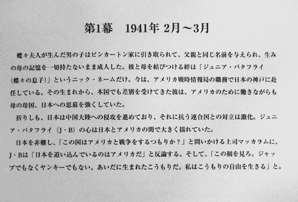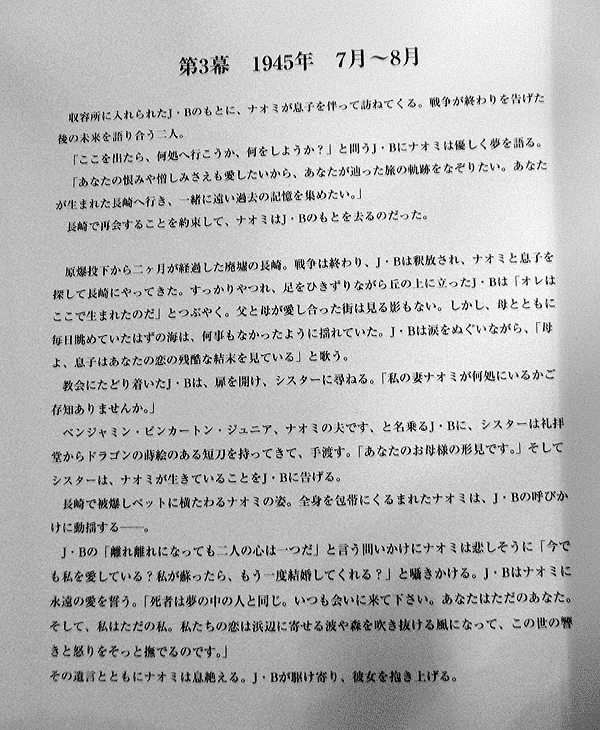 感動はやはり第3幕。ストーリーは下記に画像で挙げておくが、最後の場面にて合唱団が華々しく登場する。このような公演での合唱団は素人の寄せ集めになる場合が多いのであまり期待していなかったが、これがかなり上手く、ものすごい声量による迫力。感動を一気に高めるには十分すぎる演出だった。客席では涙をぬぐう観客もちらほらだった。テーマは第2次世界大戦だが、震災からの復興と見事に融合したのも感動の大きな理由のひとつ。それまでのイマイチだった拍手が一転、最後に至って大喝采で幕が下りた。メジャータイトルも良いが、このような新しい作品や、これまであまり光が当たらなかった作品などの方が思わぬ出会いができて面白いのかもしれない。