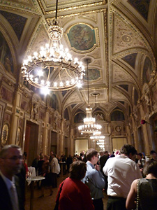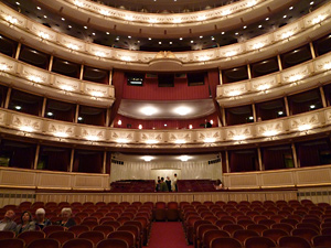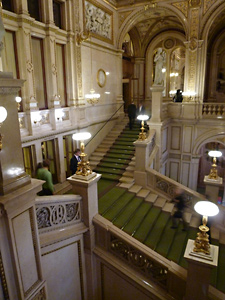 そんなこんなで3日遅れで初めてのウィーンでのオペラデビュー。昨日からザルツブルクにいたので、昼過ぎにウィーンに戻り、美術史美術館などを巡ってから優雅に劇場に向かった。ムジークフェラインでも豪華な装飾に驚いたが、オペラ座も同様に見所が豊富。細かい探索は幕間の休憩中にするとして、独特の雰囲気に胸が踊る。席は100ユーロする1階パルケット(平土間)。18列目だったので最後列だが、後列は傾斜もついていて舞台はよく見える。ただ、真後ろが壁を挟んで立ち見席(何と4ユーロ!)なので、この価格差を納得できるかどうかだろう。今日の演目は4時間半以上かかる「ローエングリン」なので椅子の有り無しはかなりポイントになるだろう。